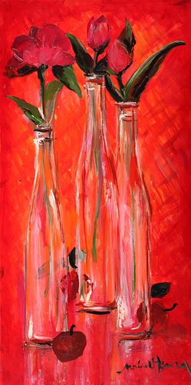 コンテンポラリーアートの展示会に出展しても違和感がない。意味もなくチューリップを3本描いている。ミッシェル・アンリの美しく古典的な三角形構図もない。3本のチューリップとチューリップが差し込まれた透明な瓶が3本長く描かれている。